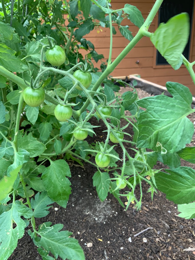 It’s springtime in Texas and my husband’s raised gardens now boast heavily laden plants burgeoning under the weight of green tomatoes. In a few weeks the hot sun will ripen these little tomatoes and they will blush a beautiful red. Then the harvest. Yum!